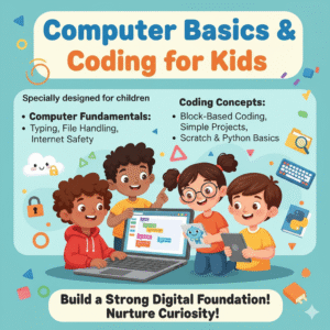 • In this course, children will learn the basics of computer use, including typing skills, file handling, and internet safety. They will be introduced to beginner-friendly coding through block-based programming and simple projects, helping them understand how to create and solve problems creatively. Using tools like Scratch and Python basics, kids will build a strong foundation in digital literacy while developing curiosity and confidence for future technology learning.