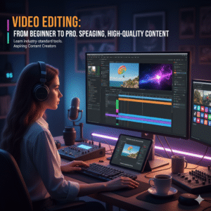 This course teaches professional video editing skills using industry-standard tools. Students will learn video cutting, transitions, special effects, audio syncing, and storytelling through video. The course also focuses on editing for YouTube, social media, and professional projects. Perfect for beginners and aspiring content creators who want to make engaging, high-quality videos.